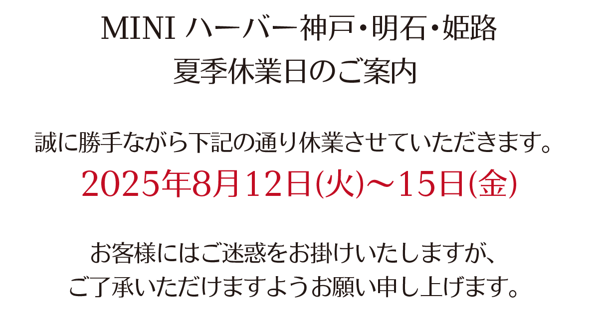 MINI明石〒651-2113 神戸市西区伊川谷町有瀬1302-1TEL : 078-978-3298営業時間 : 10:00~18:00定休日 : 火曜日及び第2・3水曜日