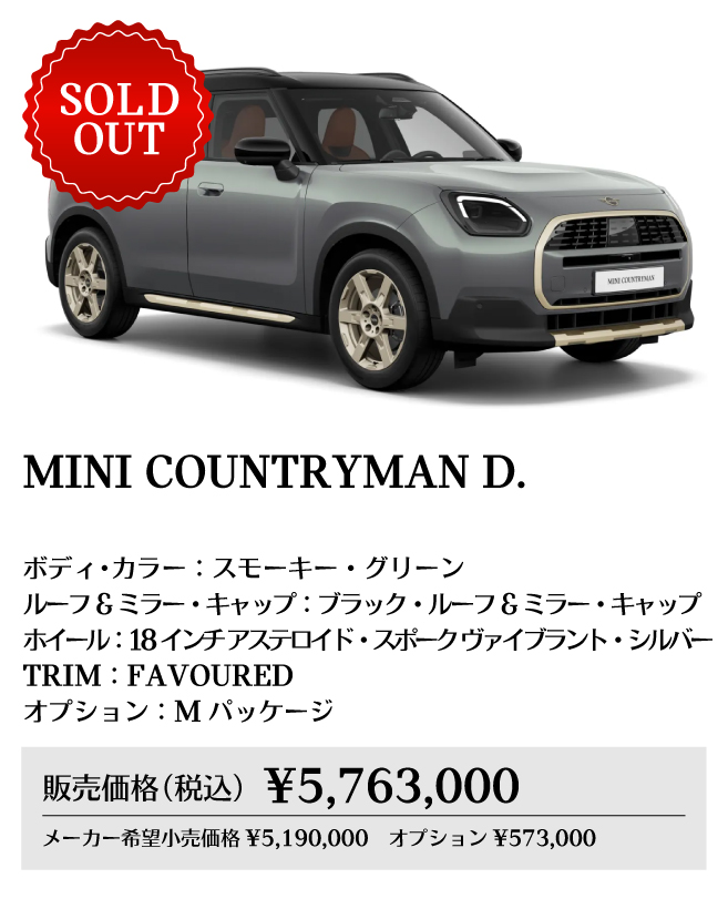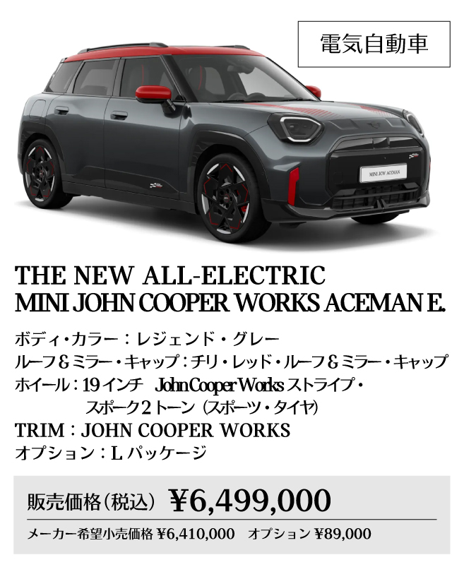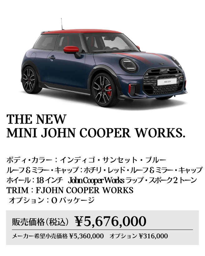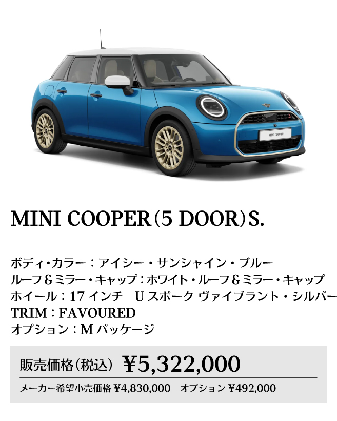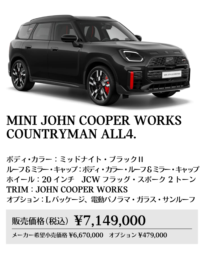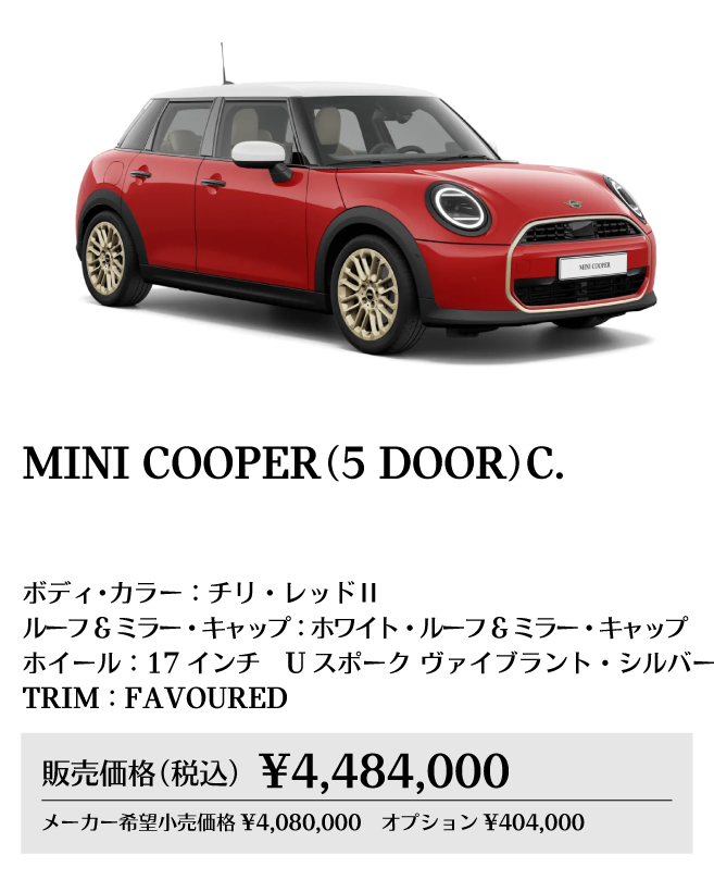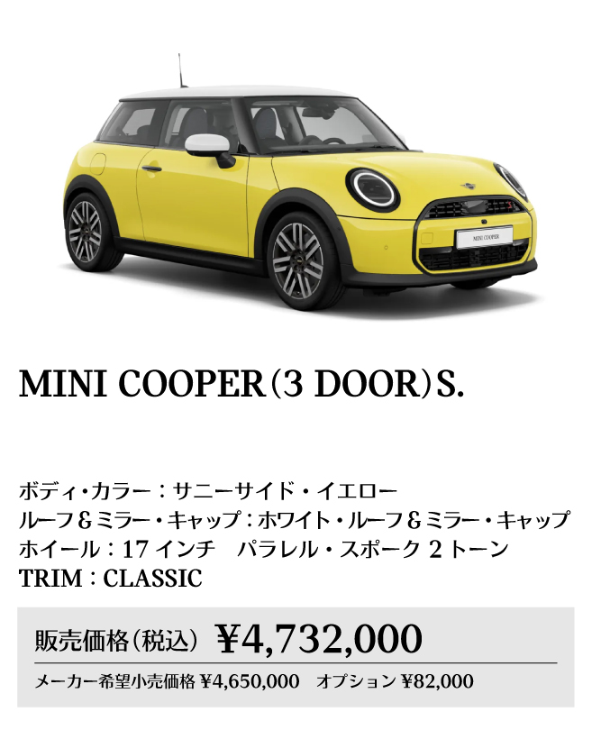 ※メーカー希望小売価格は車両本体価格(消費税込)価格を表示しています。保険料、税金(消費税を除く)、登録に伴う諸費用、リサイクル料金は含まれておりません。別途必要となります。詳細につきましてはお近くのMINI正規ディーラーまでお問い合わせください。※掲載の写真は、日本仕様のモデルと細部で異なる場合があり、一部イメージ画像も含まれます。本仕様、諸元、価格等、記載の内容は2025年8月現在のものであり、予告なく変更される場合があります。写真は実際の色と異なる場合があります。記載事項および写真の版権は、BMWAG(ドイツ)およびビー・エム・ダブリュー株式会社に帰属します。無断転載を禁じます。詳細につきましてはお近くのMINI正規ディーラーにお問い合わせください。